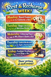 Monday, February 2-Crib Club at rec-Dungeons & Dragons club at rec-board games in the cafeteria at rec – pick up Rest & Recharge bingo cards too-3-5:00 Junior Band practice-4-5:30 Varsity…