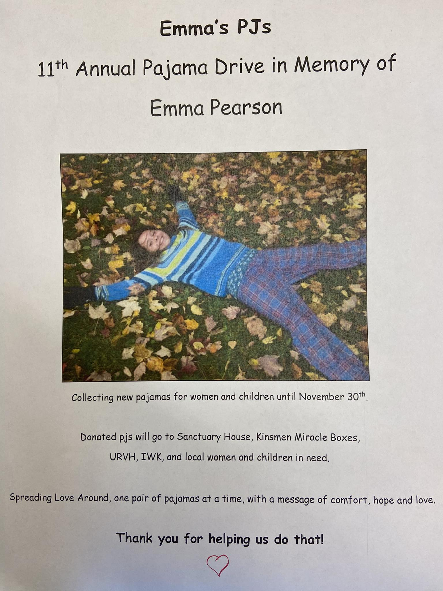 Please join us in collecting pajamas for the month of November in memory of former student, Emma Pearson. For three Fridays in November; November 7, 14 and 21, we will have PJ day. Students will pay $1 to wear pajamas. All proceeds will go directly to purchasing pajamas for local families in need. We are also collecting pajamas. If you are able, please bring in a new pair and place them in the bin outside Ms. Keenan’s office. Thank you for your continued support with this pajama drive.Β